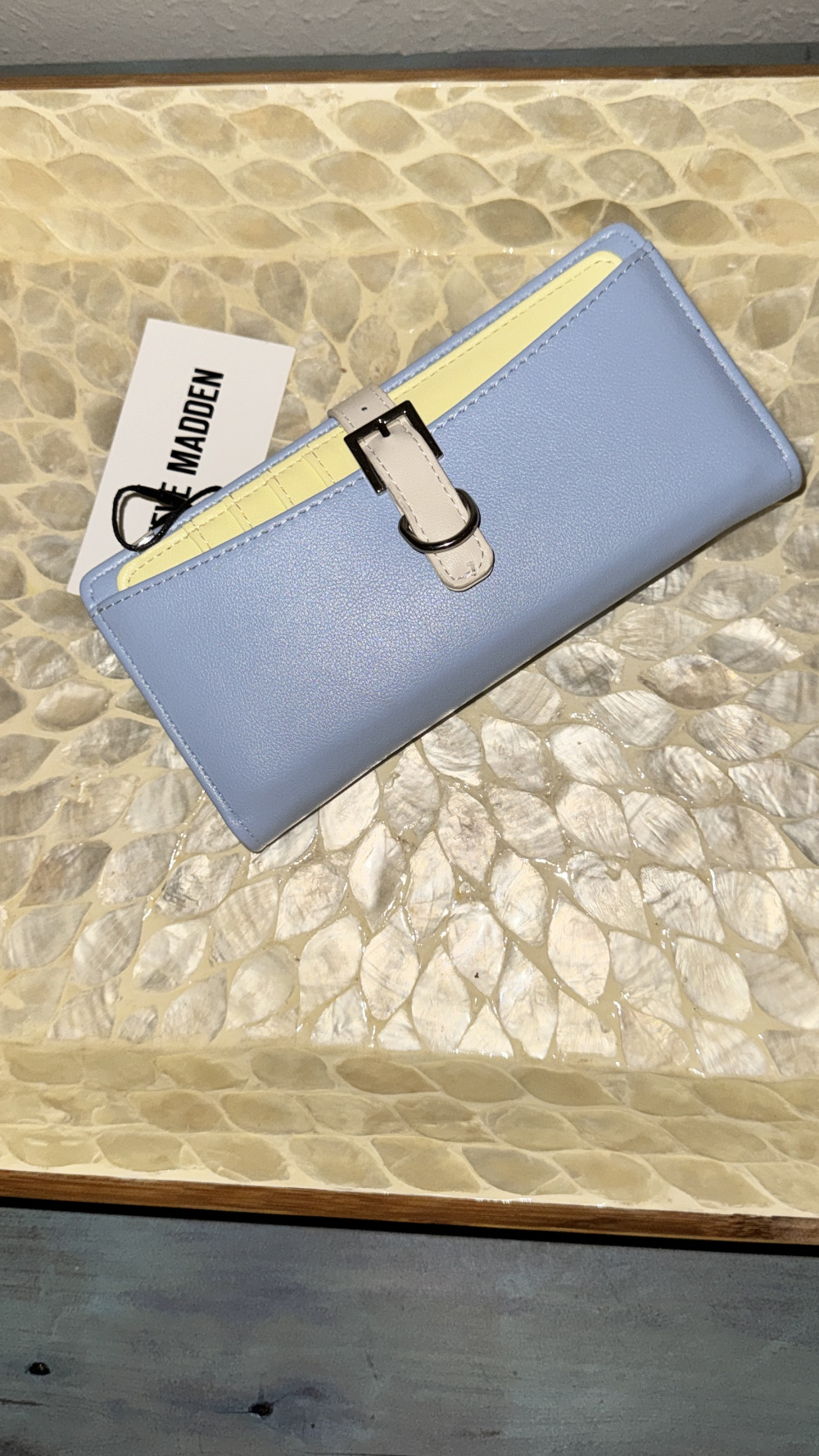 Steve Madden Pale Blue & Yellow Wallet - Snap Closure, Two Exterior Pockets, Credit Card Holder with 8 Slots, 12 Interior Slots, One Interior Zipper Pocket - 7.5"W x 3.5"H