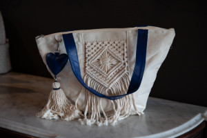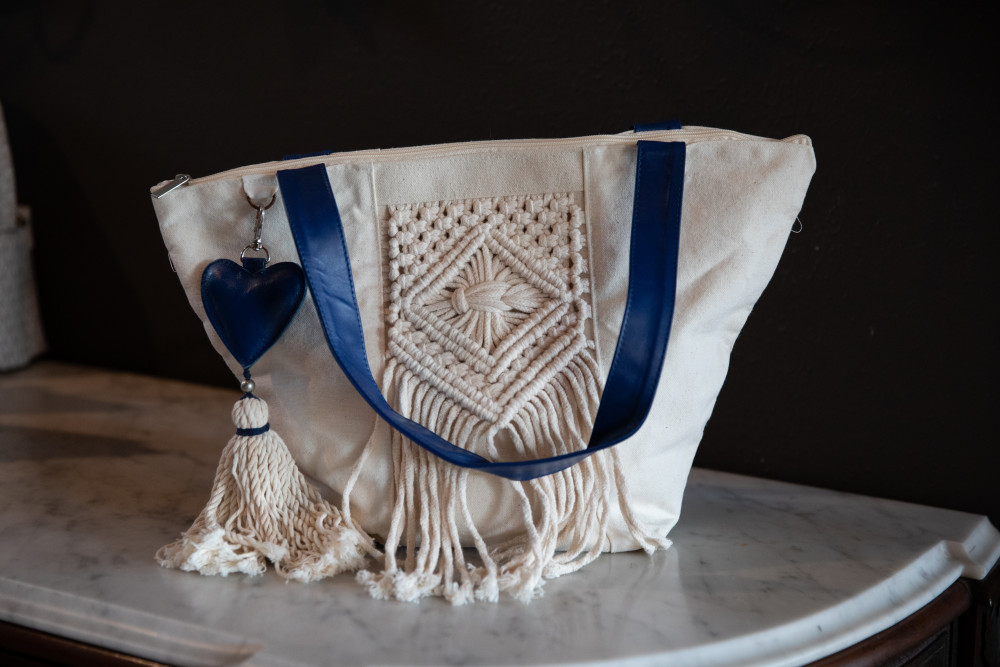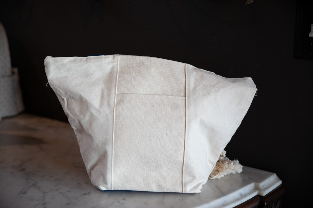 Handmade Mexico Estudio Cream Canvas & Blue Leather Tote - Two Handles, Zip Top Closure